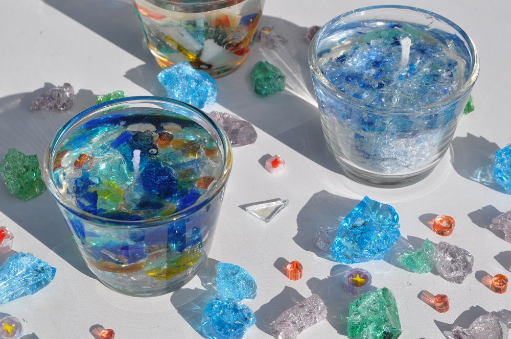 キラキラ輝くガラスのかけらを選んでカップに詰め、湯煎で溶かしたジェルキャンドルを流し込む、ワークショップです。