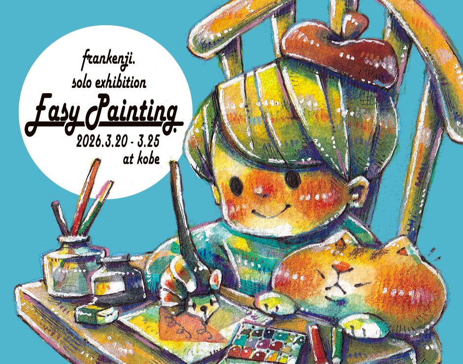frankenji.の個展「Easy Painting.」を開催いたします。frankenji.が描く小さな作品を中心に、肩の力を抜いて楽しめる展示会です。ゆったりと frankenji. の世界に浸りながら、くつろいだ時間をお過ごしください。原画以外にも、1階ショップではイラストを使ったチャームやバッジ、キーホルダーなどのグッズを販売いたします。